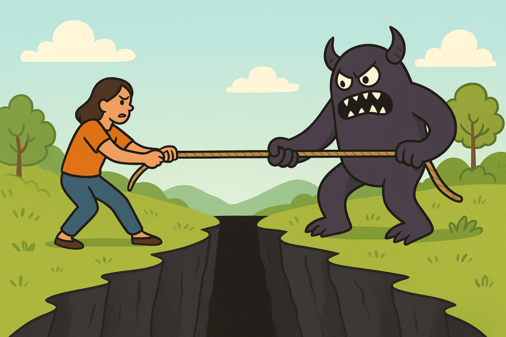 Stel je voor dat jouw lijden, jouw vervelende sensaties, gevoelens en gedachten, de vorm hebben van een duister monster en dat dat duistere monster aan de andere kant van een ravijn staat. Dat ravijn is groot en diep en jij wilt daar zelf niet invallen, maar als het monster er in valt is het eindelijk weg! Dat wil je natuurlijk graag. Je wilt immers van je nare sensaties, gevoelens en gedachten af. Dus je gaat touwtrekken met het monster. Logisch, toch? Je trekt zo hárd je kunt om het monster het ravijn in te krijgen, maar hoe hard jij ook trekt, het monster trekt altijd net zo hard, of misschien zelfs iets harder dan jij. Dat is vermoeiend. Je kunt het echt lang volhouden. Soms wel járen of decennia, maar uiteindelijk wint het monster het toch. Dat hebben we gemerkt, want jouw vermijddingsstrategieën werken vooral op korte termijn, maar niet op lange termijn. Je hebt een touw in handen, armen moe, benen moe, je hele lijf is moe en dat monster staat er nog steeds. Het eist ál je aandacht op. Het. Moet. Weg. … Dus, wat doe je dan? Wat dacht je van.. het touw loslaten? Stop de strijd. Dát is acceptatie. Het monster verdwijnt niet. Dat staat nog aan de andere kant. Wel heb jij nu je handen vrij. Je kunt uitrusten. Misschien kun je zelfs je leven oppakken.